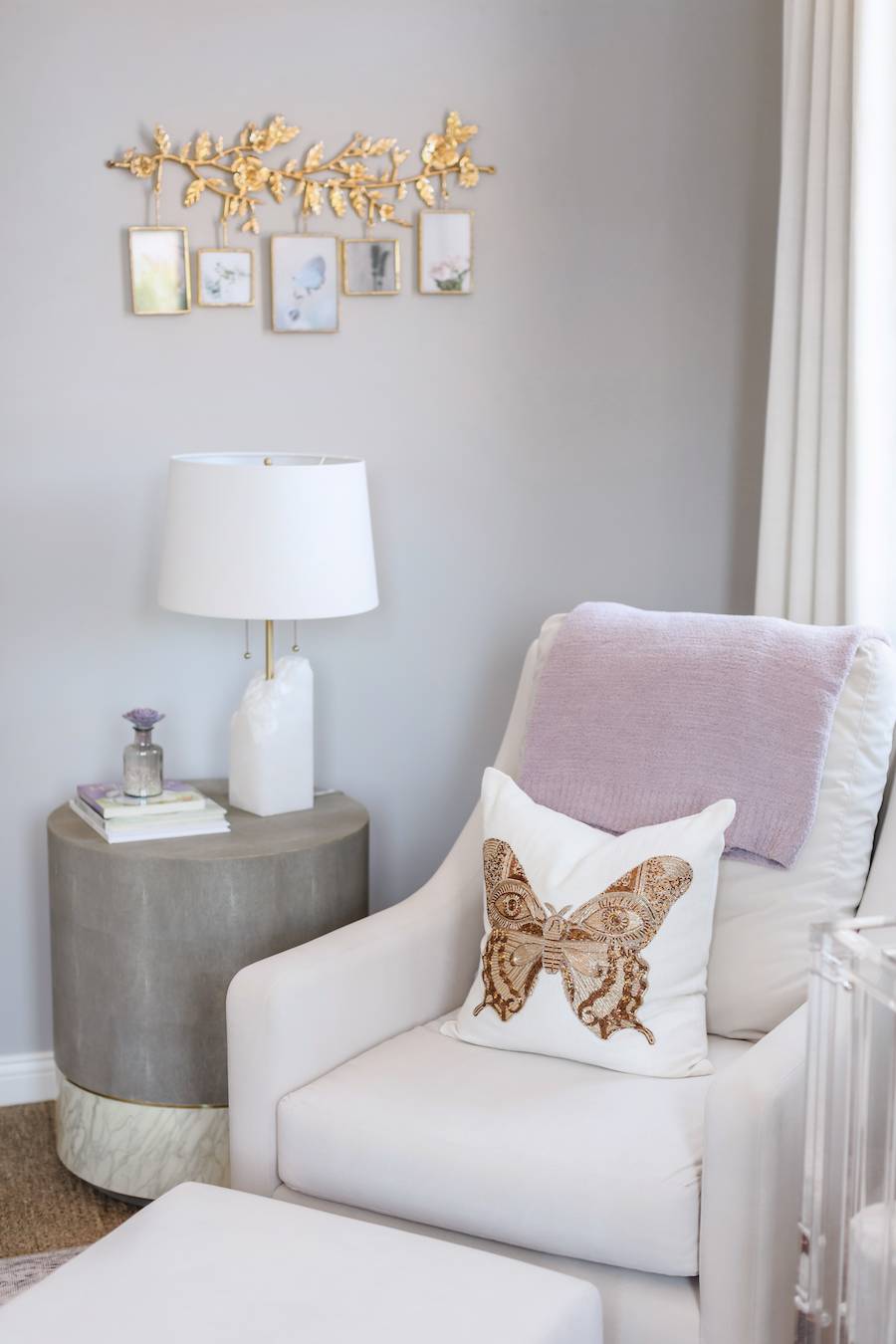 This traditional lavender nursery was designed for a client in Newport Beach, CA. The client wanted a space that was sophisticated and traditional, but that included some modern elements as well. We started with a color palette of soft lavender and gray, and added warmth with gold details. A modern rose gold and acrylic crib is the feature of the room!