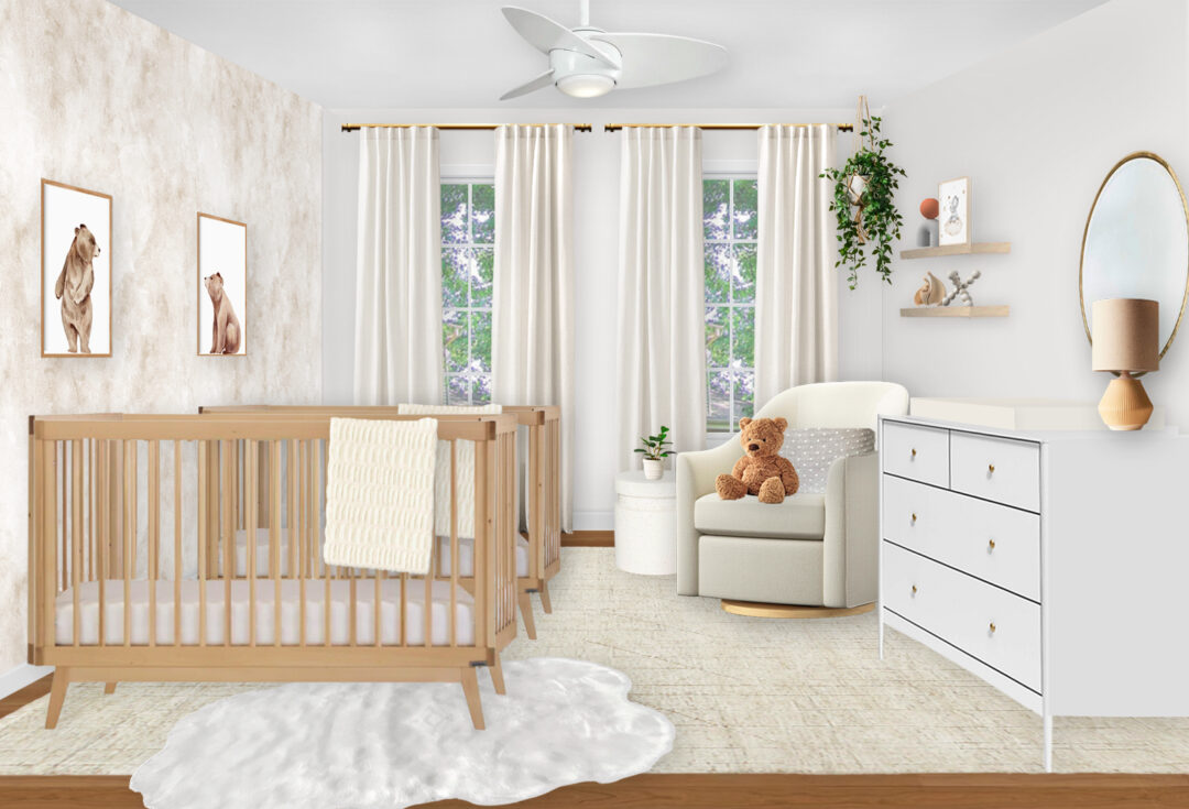 We’ve designed a few nurseries for twins over the years. When you’re expecting twins, the challenge is doubled, and space is typically the biggest issue. Recently, we had the pleasure of designing a nursery for a family expecting twins. The parents wanted a neutral color scheme that would work for both babies and chose to go with light wood cribs, a white dresser, and blackout curtains. Here’s a closer look at the design.