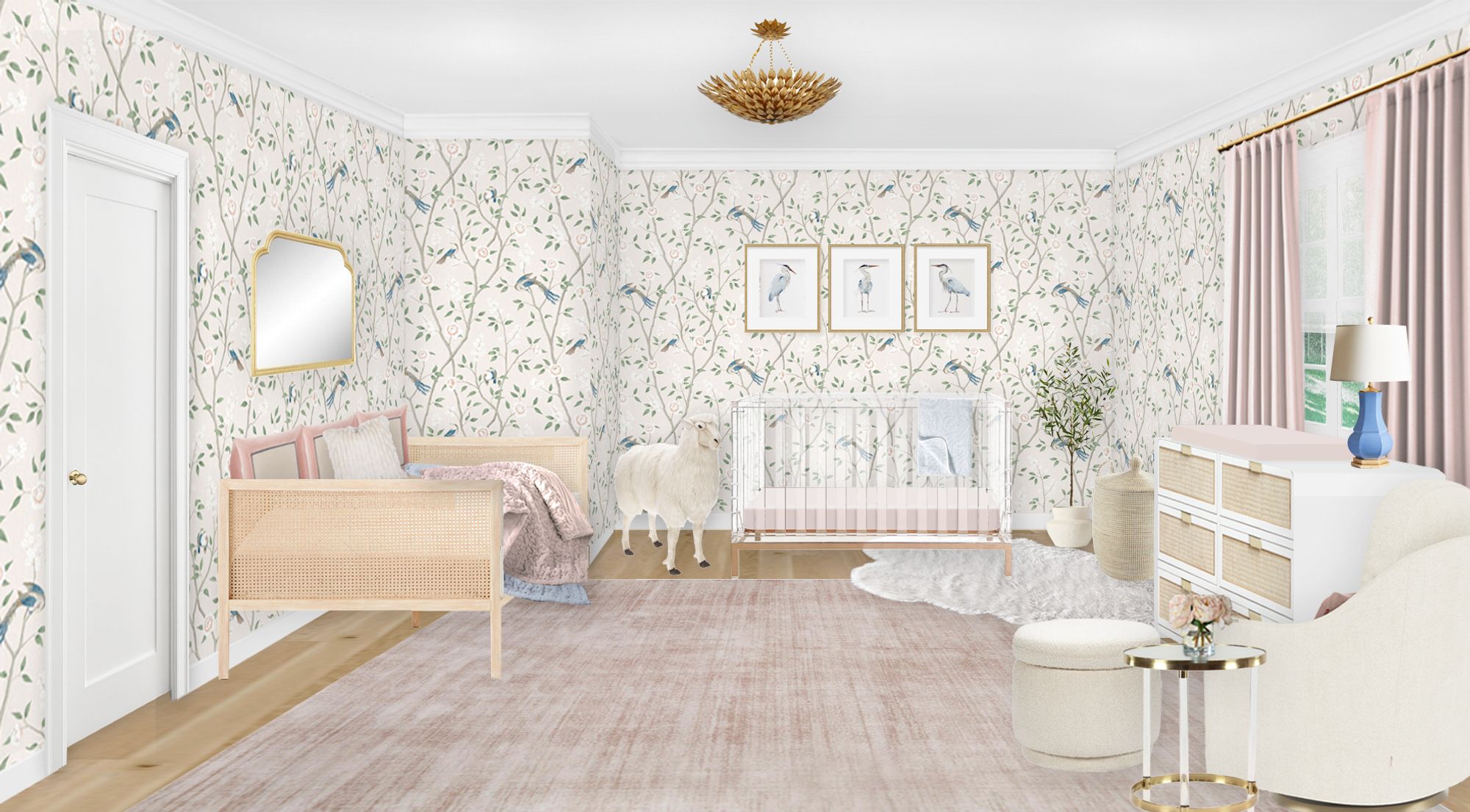 Delicate Floral Wallpaper | Acrylic Crib | White Dresser | Natural Rattan Daybed | Neutral Glider | White Storage Ottoman | Acrylic and Gold Side table | Antique Gold Chandelier | Floor Lamp | Mauve Rug | Faux Sheepskin Accent Rug | Gold Arch Mirror | Bird Wall Art | Gold Frames | Neutral Storage Bin | Knit Throw Blanket | Faux Olive Tree | Neutral Planter | Blush Throw Pillows | Muslin Baby Blanket | Large Plush Sheep