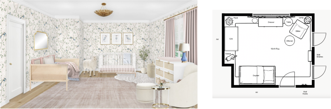 We started with this pretty delicate floral wallpaper that has a soft neutral background—that way the room will still feel bright and airy. The client wanted the room to feel somewhere in between traditional and modern, so we included elements of both. The acrylic and gold crib is a stunner, and we paired it with a white dresser with cane detail. The cane detailing brings some warmth and texture into the nursery, which we then mirrored on the other side of the room with the cane daybed. The glider is a bit hard to see in this rendering, but it’s a gorgeous curved back glider in a neutral fabric. We paired that with an acrylic and gold side table to coordinate with the crib.