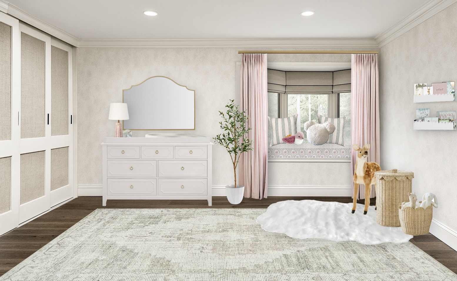 For the foundational items, we went with classic white nursery furniture that would last her through multiple children. The subtle sage green rug brings in the artwork, but will work well even if the bird elements are later changed since sage green is still considered a neutral. The scalloped wall shelves, gold wall mirror, white side table, and scalloped storage bins are all neutral and transitional pieces that can rotate into a future room. We did have a little fun with the custom blush pink blackout curtains, and also brought in some more color with the blush crib sheet and gorgeous faux peony arrangement.